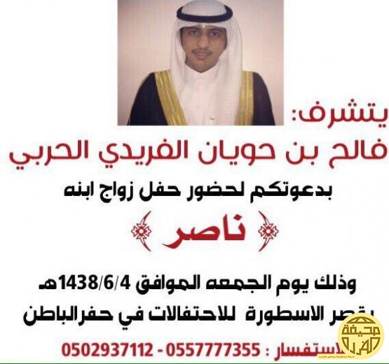 يتشرف فالح حويان الفريدي بدعوتكم لحضور زواج ابنه ناصر مساء الجمعة ١٤٣٨/٦/٤هـ قي قصر الأسطورة للاحتفالات في حفر الباطن حضوركم شرف لنا