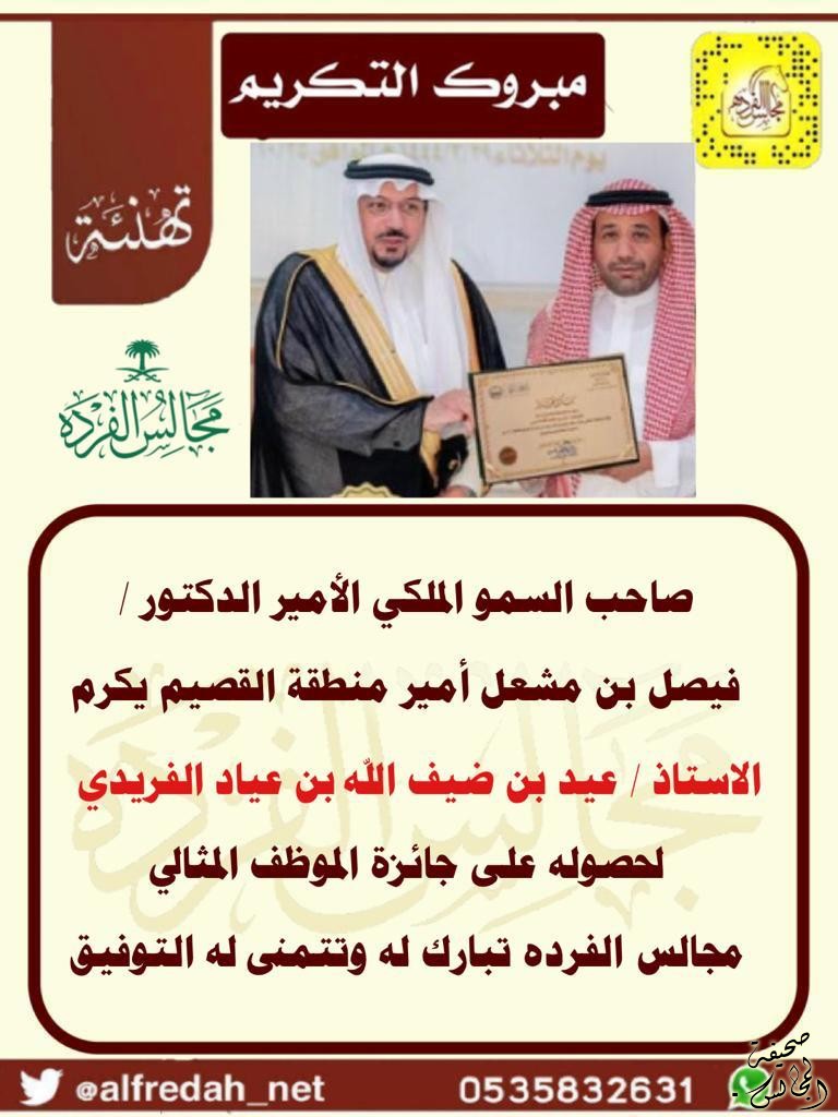 أمير منطقة القصيم يكرم الاستاذ/ عيد بن ضيف الله بن عياد الفريدي