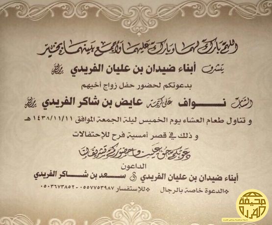 يتشرف أبناء عليان بن ضيدان الفريدي واخوانه بدعوتكم لحضور حفل زواج اخيهم الشاب نواف